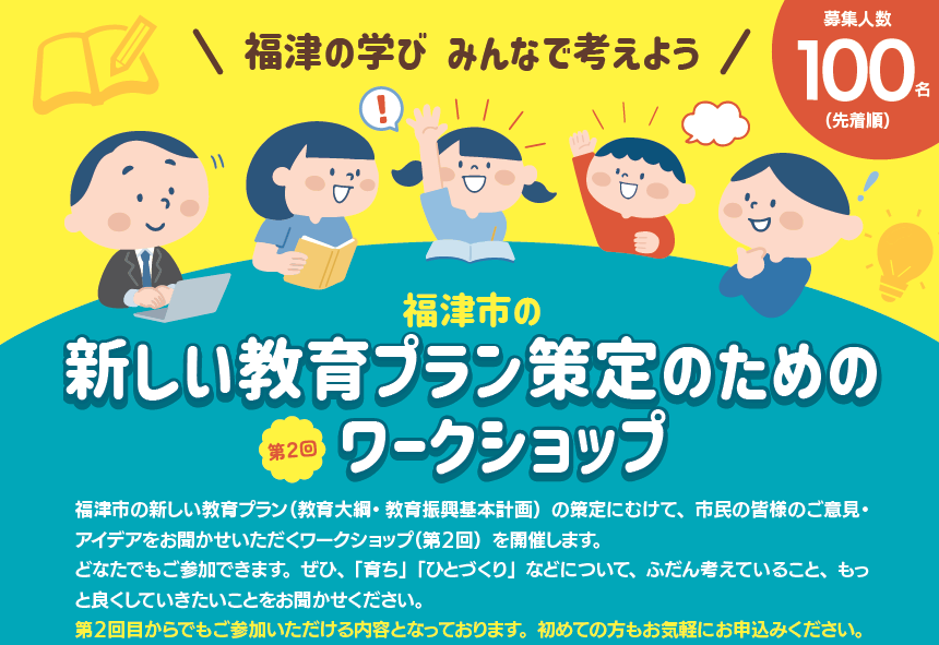 今回、これからの教育の指針として、新しい教育プランを策定していくため、市民の皆さんのご意見・アイデアをお聞かせいただくワークショップを開催します。