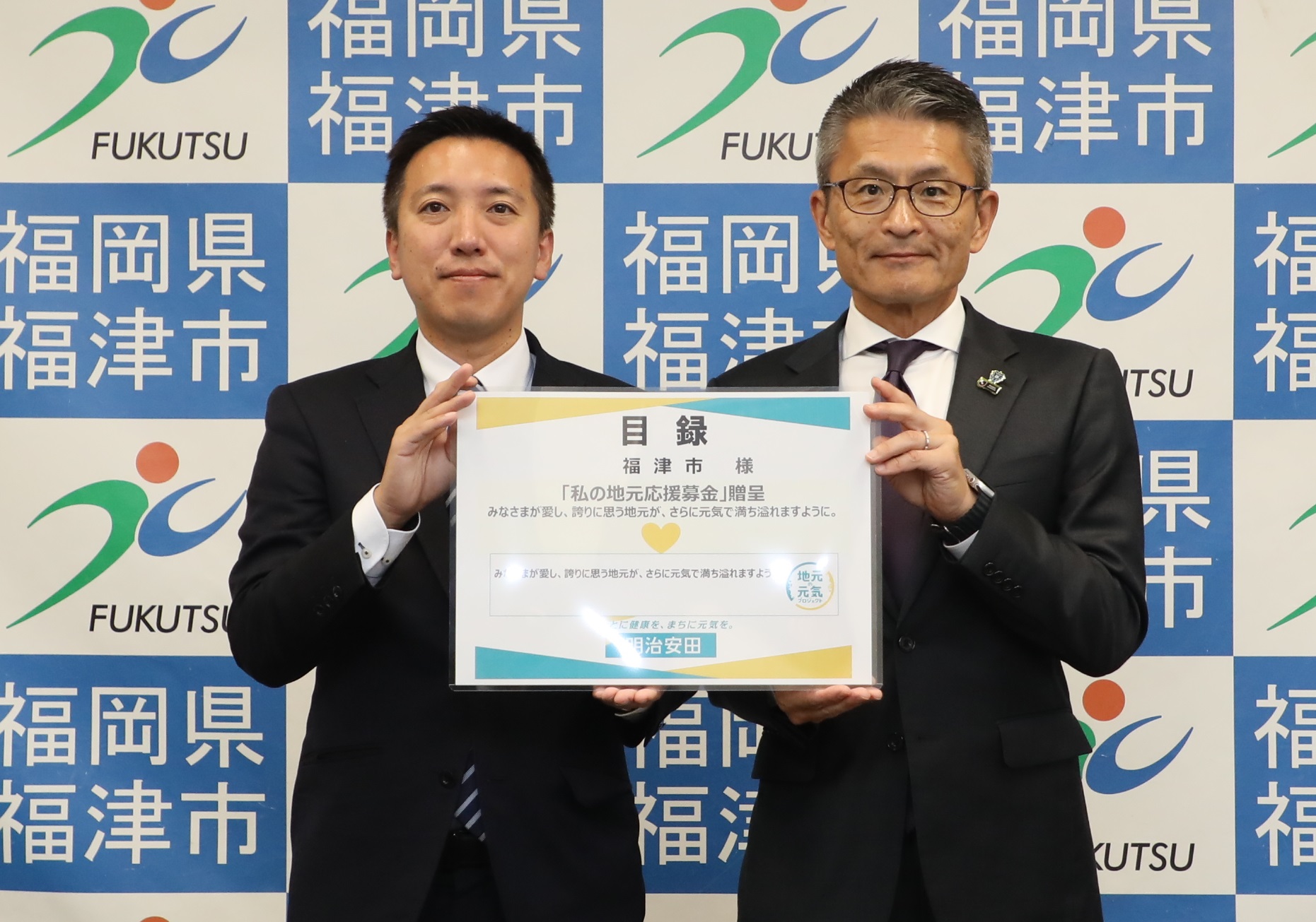 地域の健康増進や介護・認知症対策、子育て支援に役立ててほしいという思いのもと、明治安田生命保険相互会社福岡支社から「私の地元応援募金」の寄付をいただき、11月18日に目録の贈呈式を行いました。