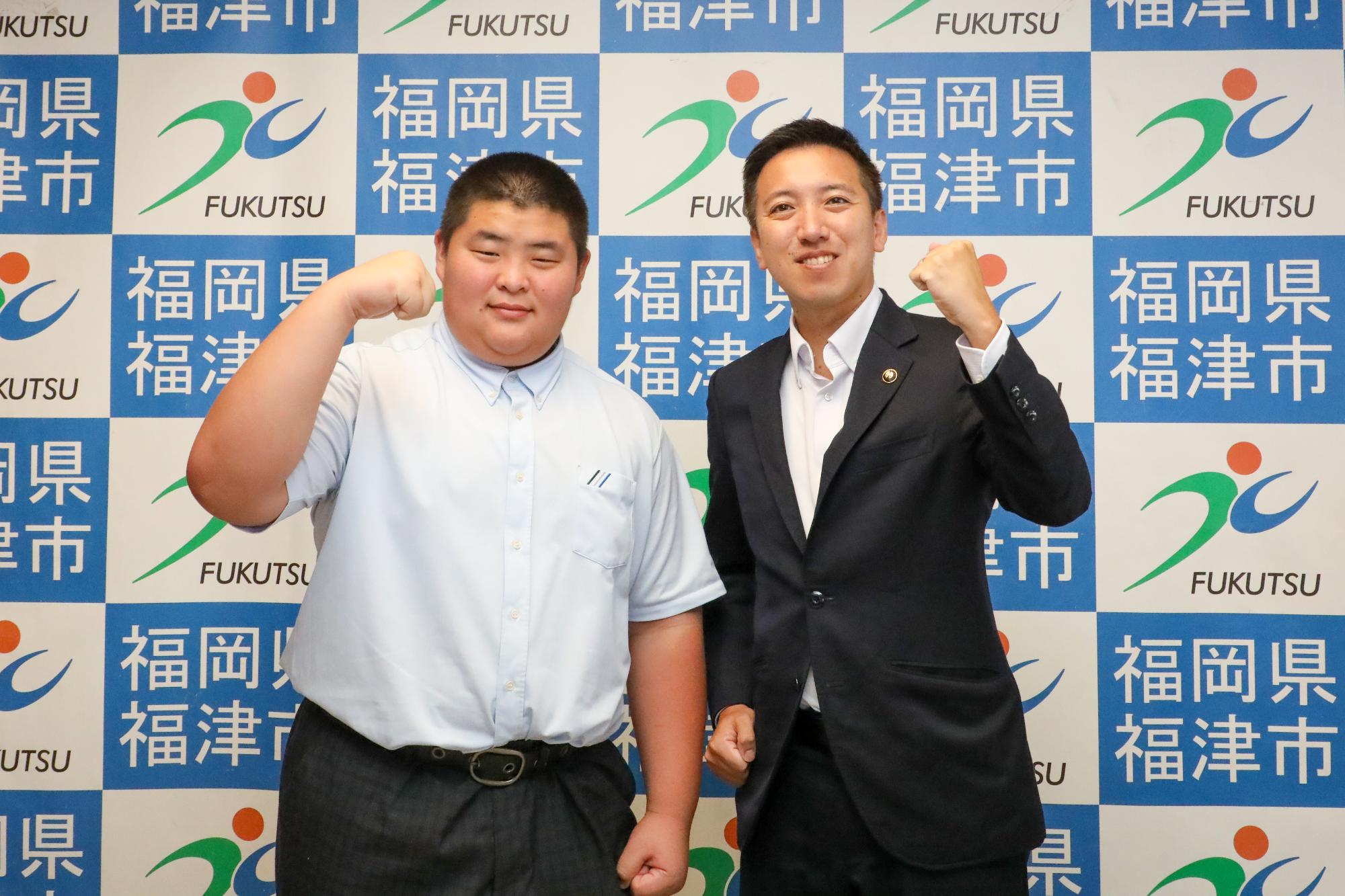 各都道府県から選抜された中学生が出場する「第36回全国都道府県中学生相撲選手権大会」に出場したことを報告するため、福間中学校3年生の福本崇吉さんに8月25日に表敬訪問いただきました。福本さんは、この大会のほかにも8月5日から開催された「第53回九州中学校相撲競技大会」、8月20日から開催された「第55回全国中学校相撲選手権大会」に出場しています。