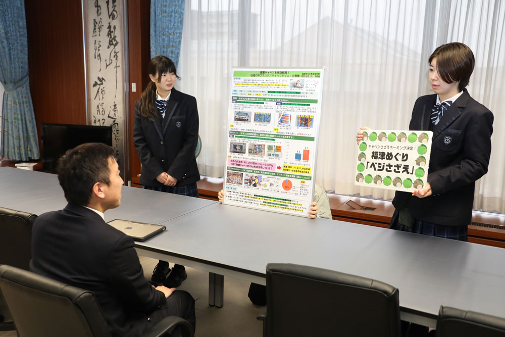 2月24日に福岡県立水産高校の西原彩夏さん、波多愛花音さんのおニ人が、市役所を訪問されました。昨年12月に開催された「第34回全国水産・海洋高等学校生徒研究発表大会」で、「全国水産高等学校長協会 奨励賞」を受賞したとの報告です。