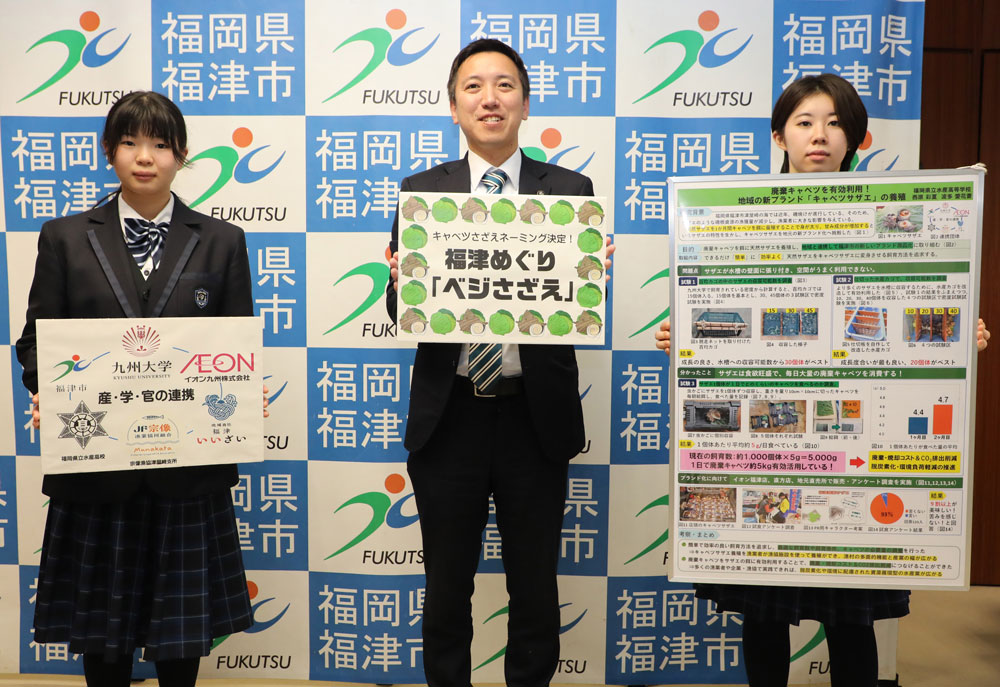 研究テーマは「廃棄キャベツを有効利用!地域の新ブランド“キャベツサザエ”の養殖」。津屋崎の海で進む磯焼けによりサザエの漁獲量が減少している現状を踏まえ、福津市の特産品であるキャベツの外葉を餌として活用する取り組みを進めたとのことでした。学校や市内店舗、宗像漁協津屋崎支所、福津いいざい、イオン九州株式会社、九州大学水産実験所など、多くの関係者の協力を得ながら、昨年4月から12月まで研究を続けたそうです。