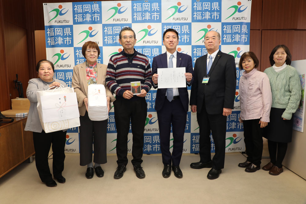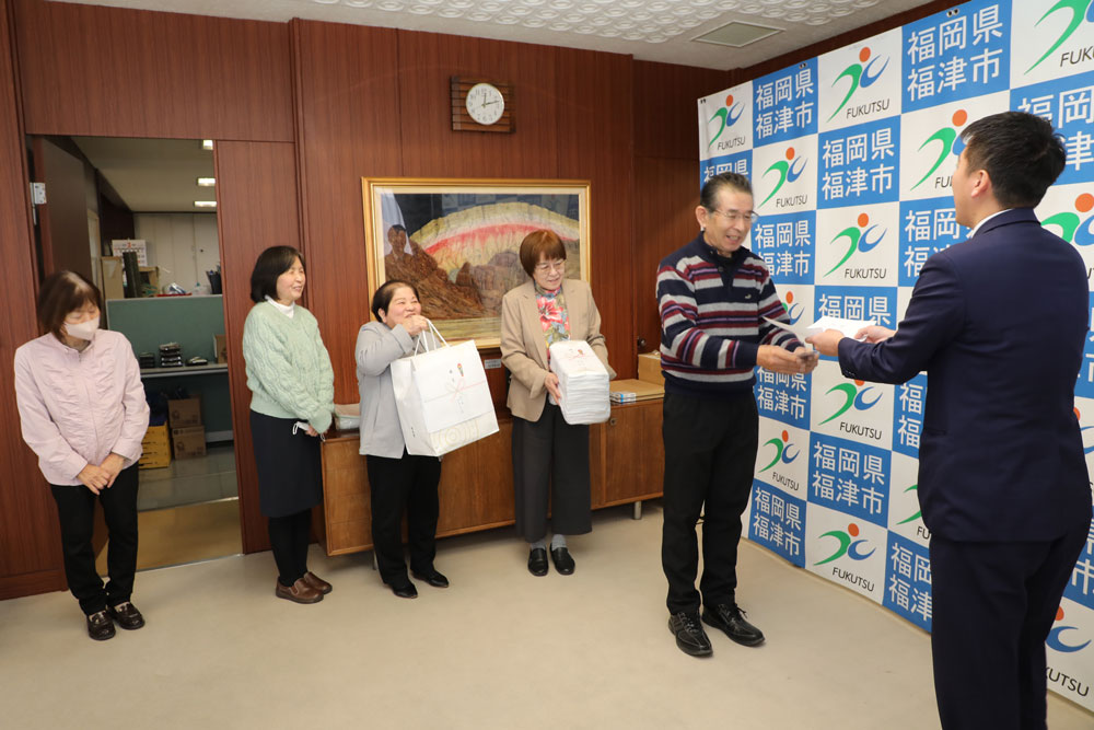 3月11日、ボランティア団体「ビーチクリーンズ」「さくらんぼグループ」「マスカットグループ」「さざなみ会」の皆さんが市役所にお越しになり、手縫いの雑巾532枚を寄贈してくださいました。毎年このようなお気持ちをいただき、感謝申し上げます。