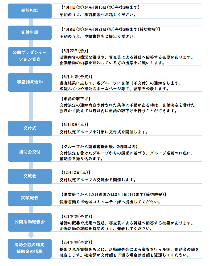 申請にあたり、(1)説明会への参加または説明動画の視聴、および(2)申請内容に関する1回以上の事前相談を行ってください。