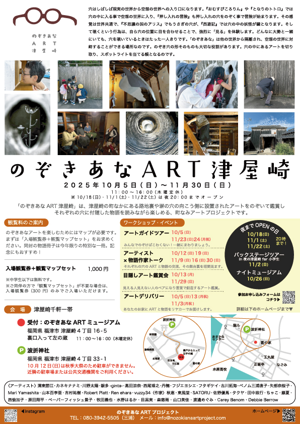 古民家が並ぶ津屋崎千軒を舞台に、町の塀や壁の穴の向こうにアートを設置しています。