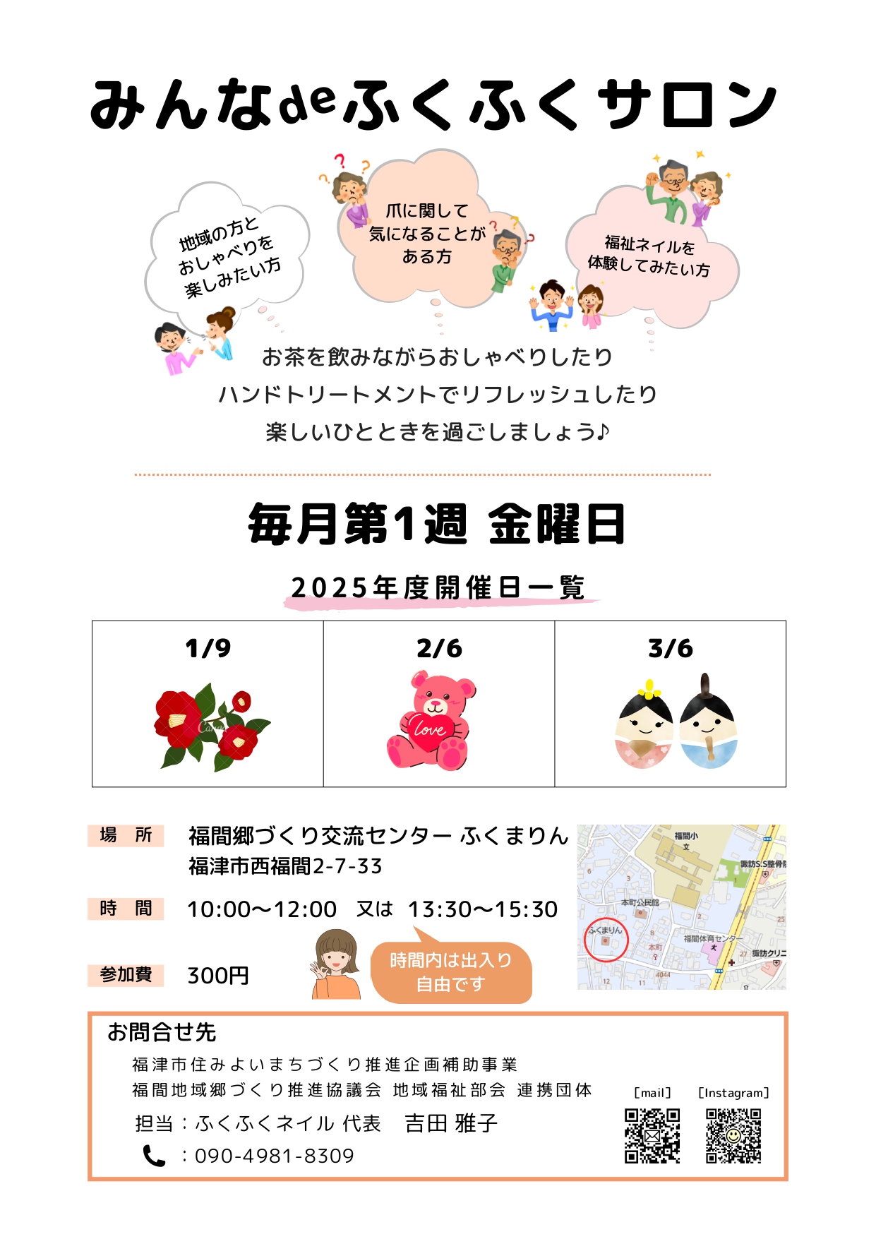 地域のかたとおしゃべりを楽しみたいかた、爪に関して気になる事があるかたなど、どなたでも参加できます。